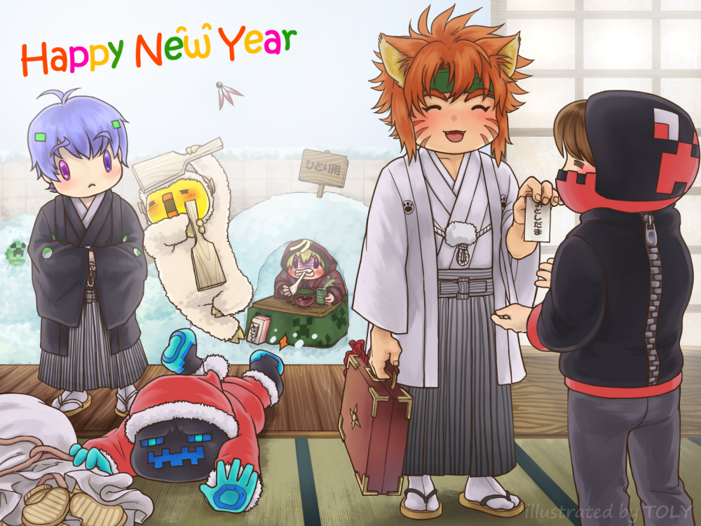新年明けましておめでとうございます。昨年は色々とお世話になり、ありがとうございました。感謝の気持ちを込め、年賀イラストを描き上げました。急いで仕上げたので雑です(^_^;) パラレルワールドなので周囲に建物なんて在りませんし土足でもお構いなしです( 今年もどうぞよろしくお願いいたします! |