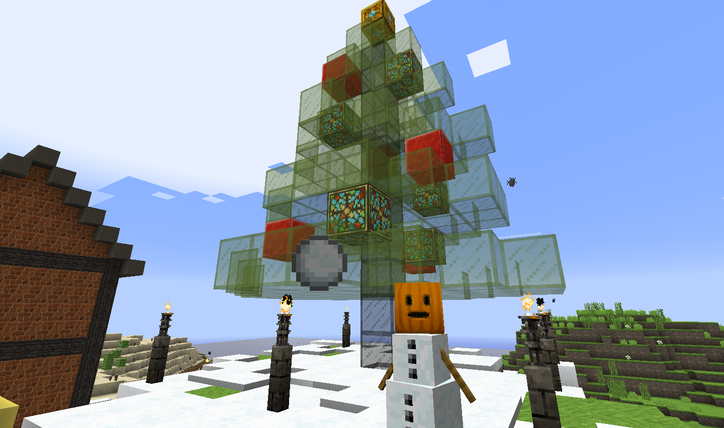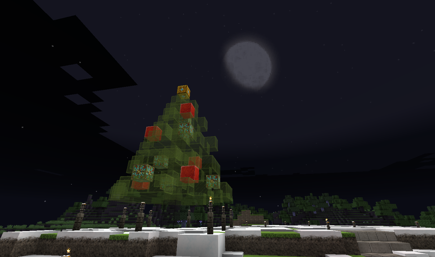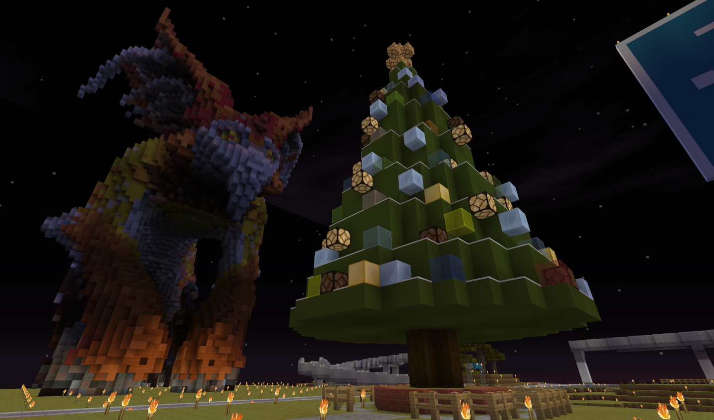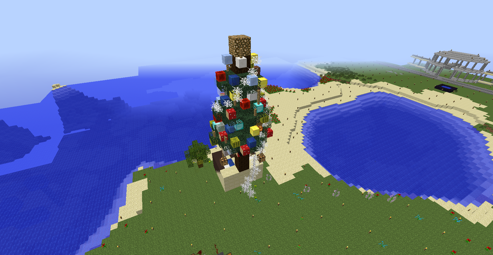 場所:(x-4144.y64.z743付近) 工夫した点:氷塊ブロックでツリーを巻いたり、キノコブロックなどの面白いブロックを使用しました。 一言:大垣村の中心部に作りました。興味がある人は見に来てみては? |
