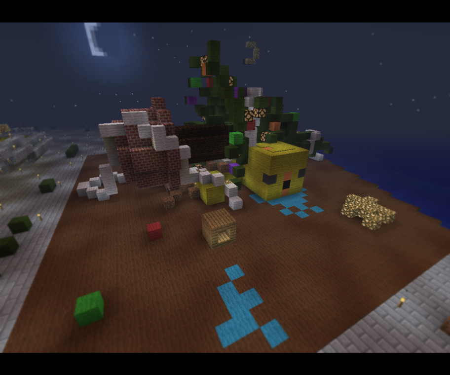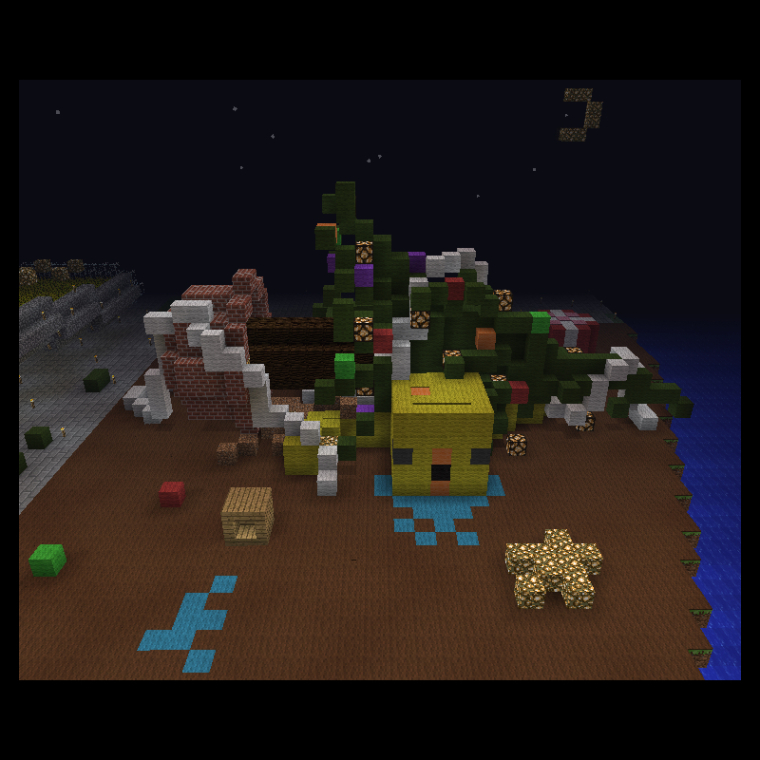 とある離れ島でクリスマスイベントに意気盛んな1羽のトリが、孤独にパーティーの準備を進めていました。 「よ〜し、これを付けたら完成だ〜」最後の飾りを付け終えたその時、大きな揺れが島全体を襲いました。 「グェーッ」カエルが潰れたような鳴き声が、離島に響き渡りました。大きな揺れでツリーが倒れ、トリはツリーの下敷きになってしまいました。めでたシ 茶番失礼いたしました。エントリーナンバー28番トリーです真面目な建築は出来ないのでネタ建築で参加します。工夫した箇所は重力で弛んだツリーの先端と、だ液の流れです。 [座標 HE:x300,z4900 ]南B付近の卵型の離島に建てました。 MAPでも確認できますが、ぜひ一度遊びにいらしてくださいネ(*^_^)ノ |