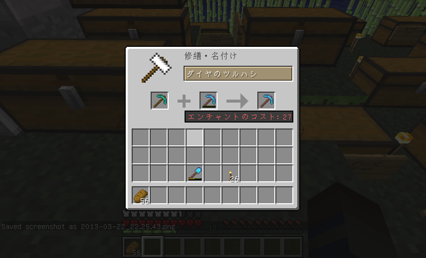で、結論を言うと、@の場合、要求されている経験値+7の経験を実際には消費しなければ金床は使用できません。なお、足りない状態で使用した場合、表示されている経験値が消費されているようにみえますが、リログ・違うワールドに移動・経験値の再取得等を行うと経験値は戻ってくるはずです。