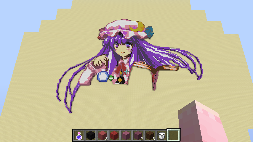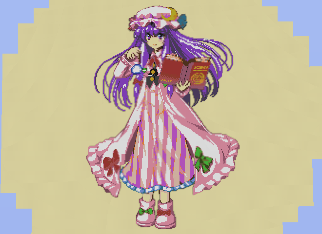 初投稿のmone0531です。自分のスキンであるパチュリー・ノーレッジのドット絵をつくろうと思いました。まだ試作段階なので完成していません。それでも作業があまりにも大変だったのでこれは自慢してもいいんじゃないかそうでもしないとやってられんとおもって投稿しました。元の画像はhttp://www.tinami.com/view/455975参考にしました。試作が終わり次第マルチにつくろうと思っています。とりあえず今日一日の結果です。(追記リアルがそれなりに忙しいため作業は土,日にやります。月から金までは材料集めをします。 |