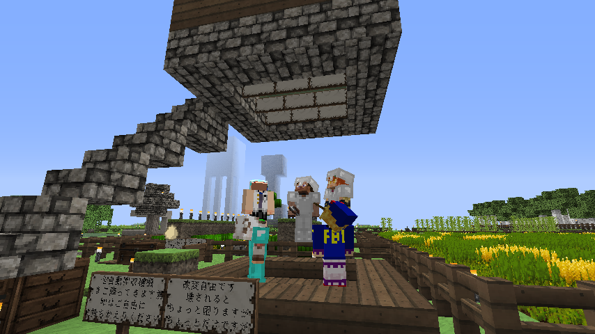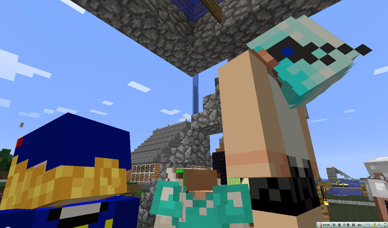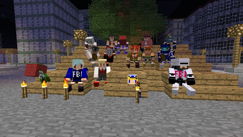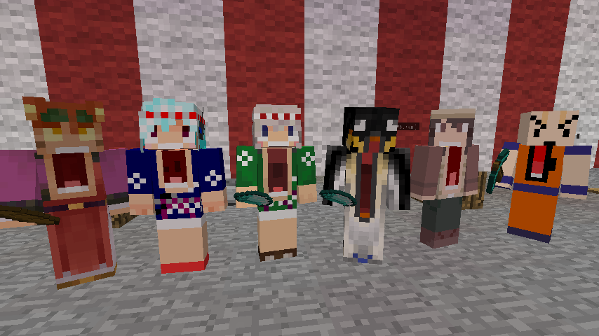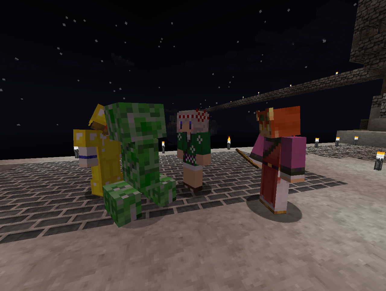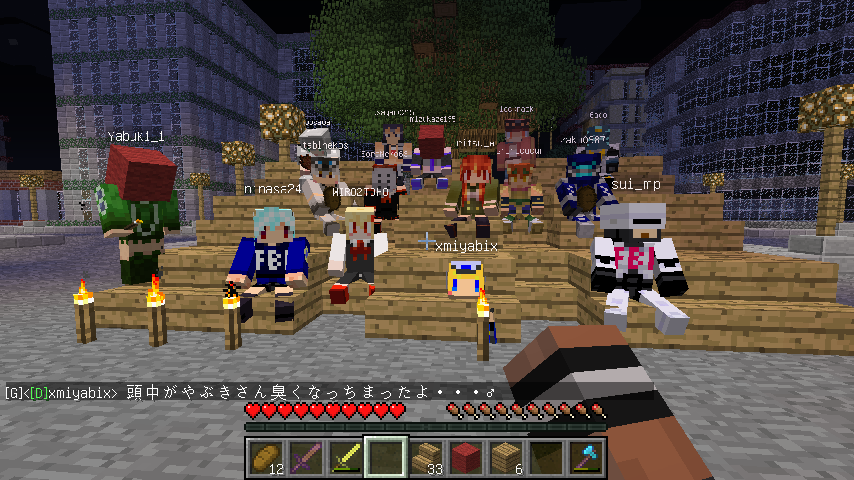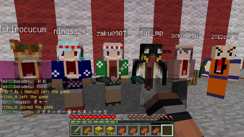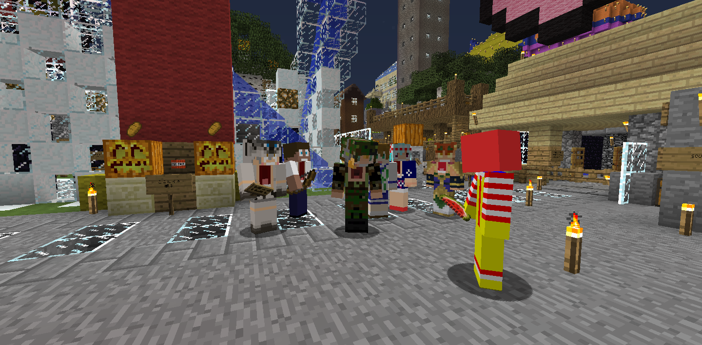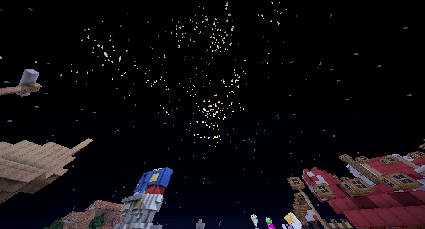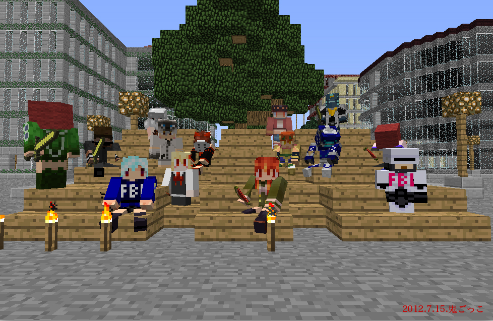 同じく12’7/14深夜から15日未明にかけて行われたおにごっこ(どろけい)の集合写真です。 試験的実施ということで兼ねてよりイベント用に用意されていたワールドの公開。 それと同時に観客を含む20人余りでおにごっこが開催された。 ルールは鬼役が赤羊毛を被り逃走中のプレイヤーを金剣で叩くというもの。 金剣でたたかれたプレイヤーは当然のように燃え上がりアウトになる。 アウトになったプレイヤーは鬼となり、さらに逃走中のプレイヤーを探すことになる。 これを繰り返し、15分経過、もしくは逃走者がいなくなるまで行われる。 今回は午前0時46分より1時1分までの決行。 試験運営ということで緩やかに試合は立ち上がり鬼側が優勢に運ぶも、 逃走者は3名が見事逃げ切り、逃走者側の勝利で終えた。 |