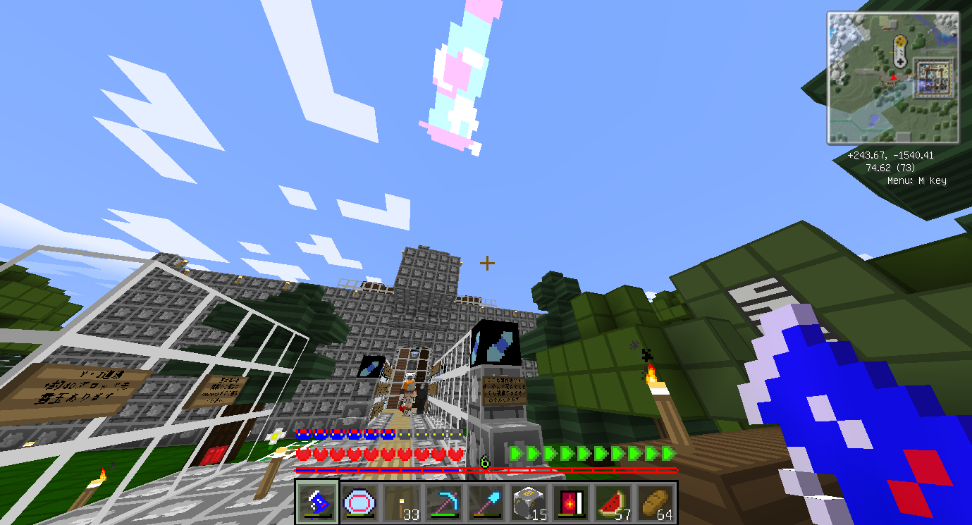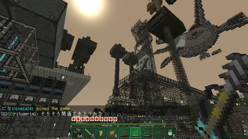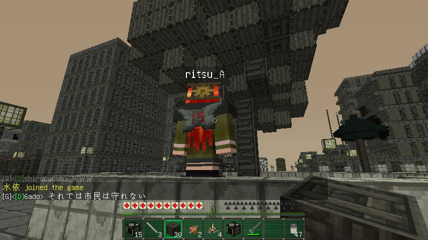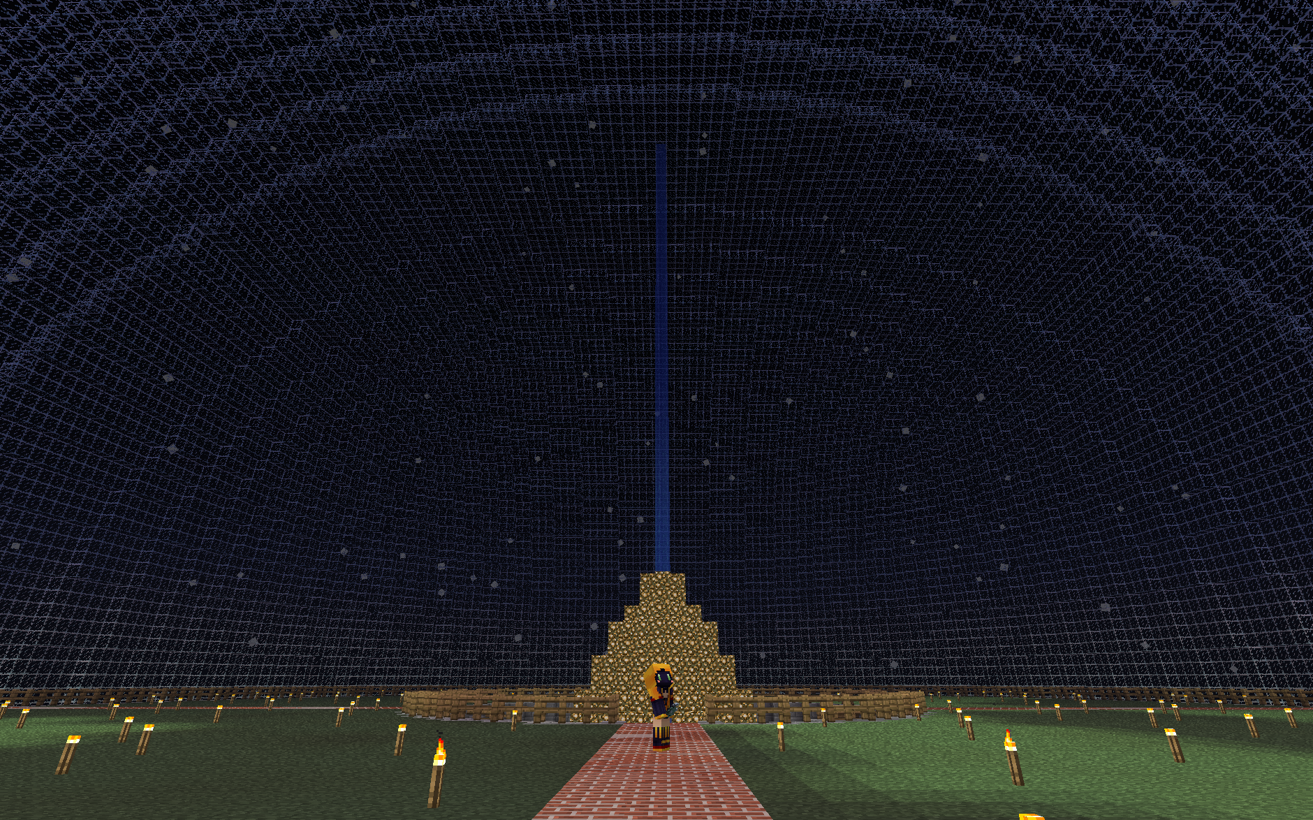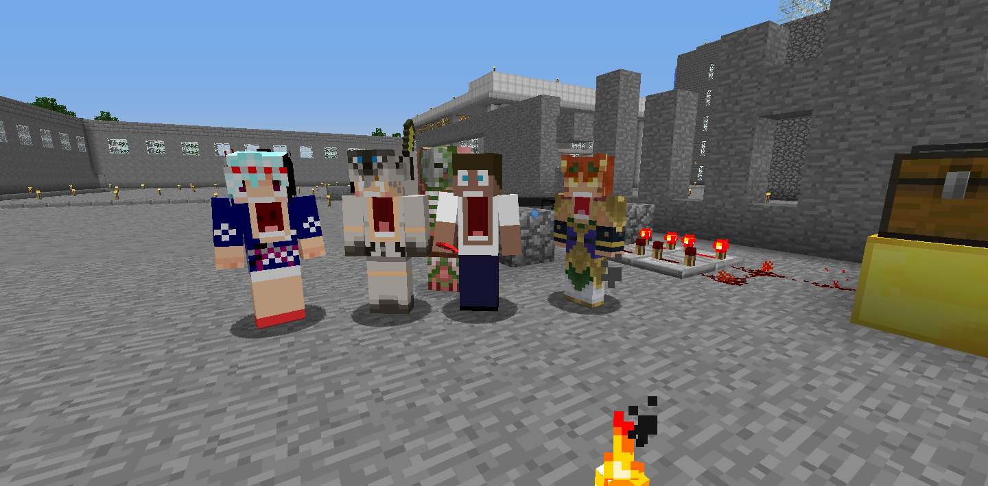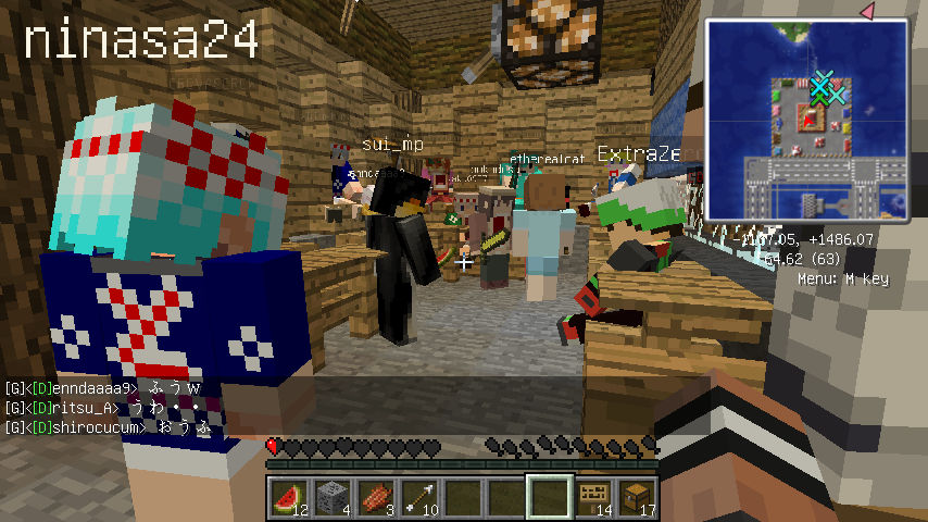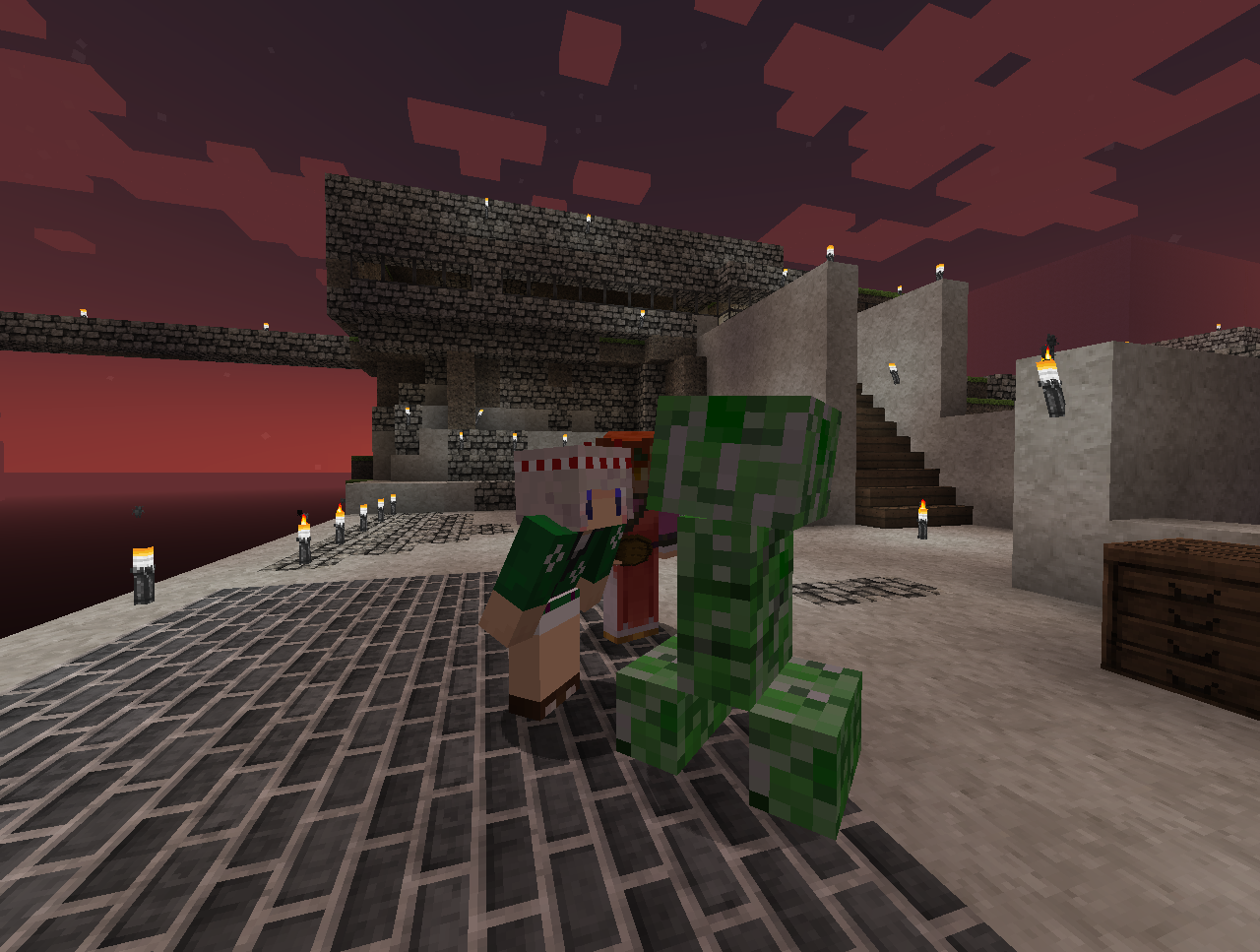 同じく12’7/14深夜から15日未明にかけて行われたおにごっこ(どろけい)の集合写真です。 試験的実施ということで兼ねてよりイベント用に用意されていたワールドの公開。 それと同時に観客を含む20人余りでおにごっこが開催された。 ルールは鬼役が赤羊毛を被り逃走中のプレイヤーを金剣で叩くというもの。 金剣でたたかれたプレイヤーは当然のように燃え上がりアウトになる。 アウトになったプレイヤーは鬼となり、さらに逃走中のプレイヤーを探すことになる。 これを繰り返し、15分経過、もしくは逃走者がいなくなるまで行われる。 今回は午前0時46分より1時1分までの決行。 試験運営ということで緩やかに試合は立ち上がり鬼側が優勢に運ぶも、 逃走者は3名が見事逃げ切り、逃走者側の勝利で終えた。 |