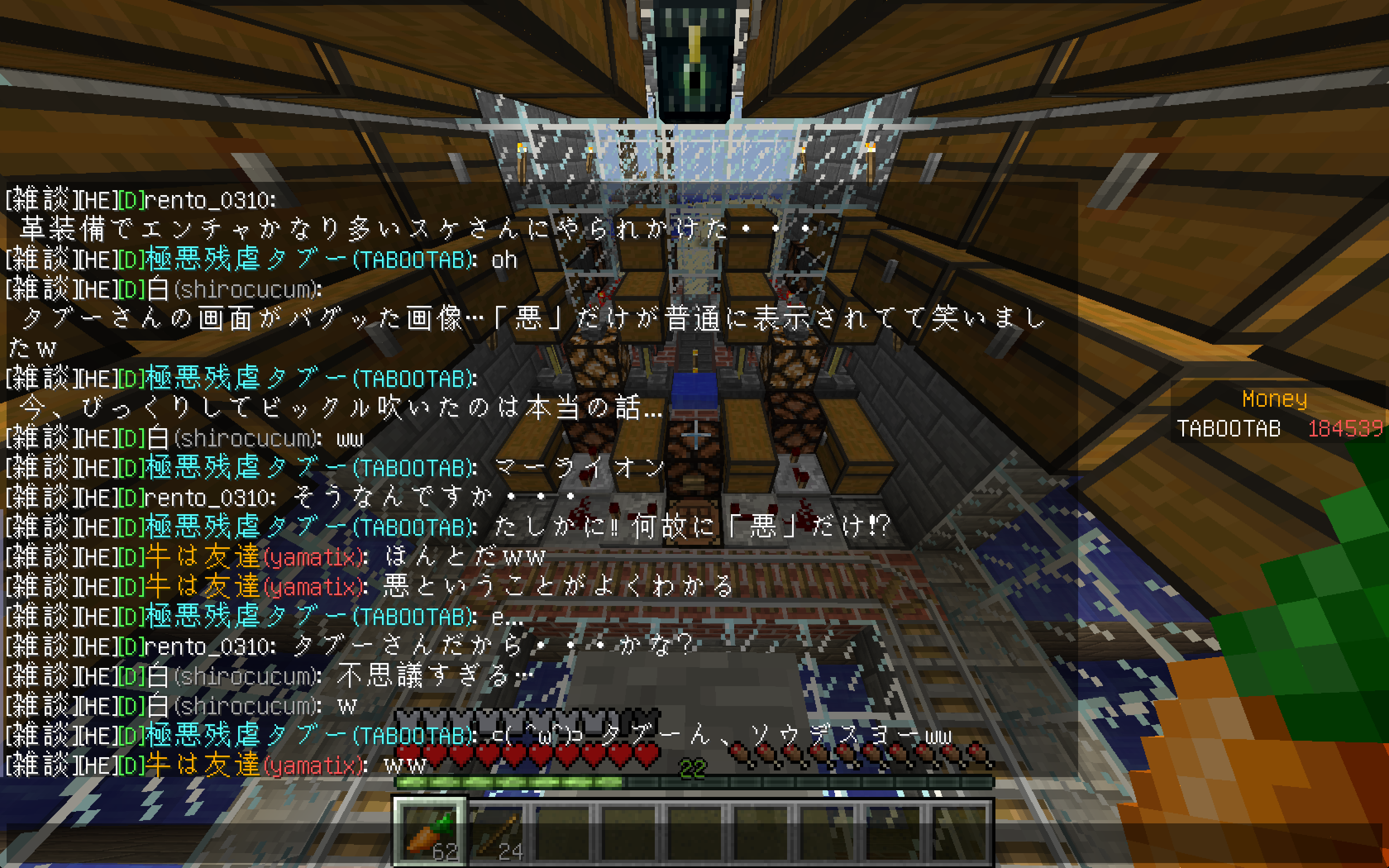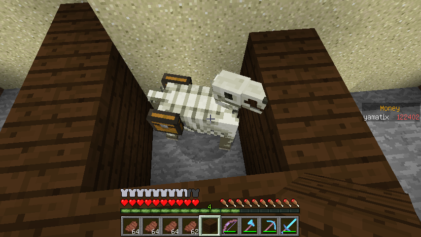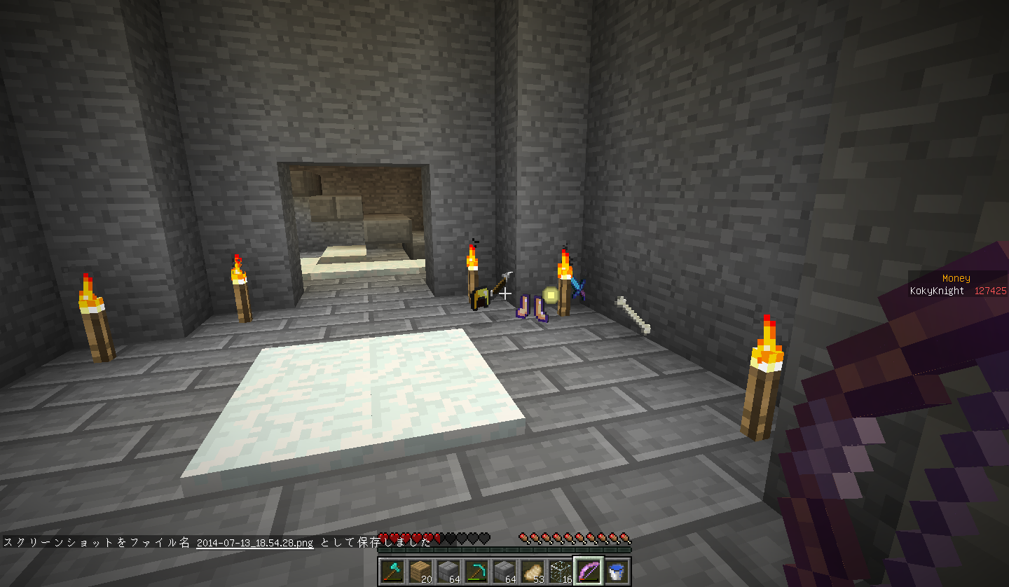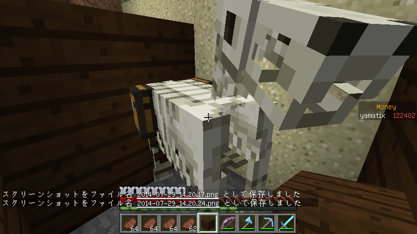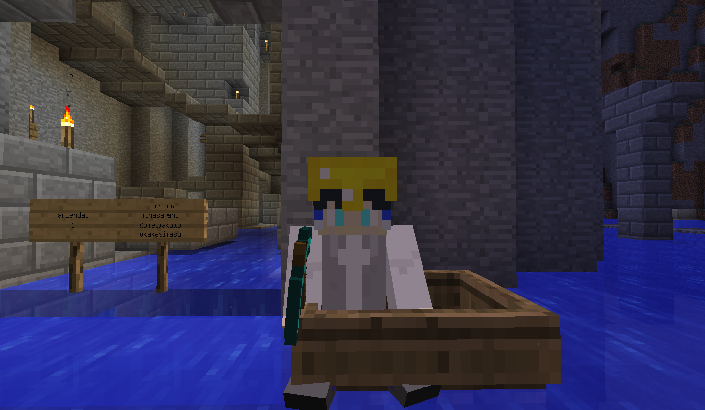 改装中の塔内での出来事。 私はいつもどおり作業の続きをしていると、足を滑らせ落下死しました。 ここまではいつもどおりで問題は無かったのです。 しかし、いざ戻ってみると金フル装備の(私の)ダイヤ剣持ちの助さんに襲われました。 偶々、近くに穴があったのでそこに突き落としましたがハートを8割持っていかれましたね。 そんで恐る恐る降りてみますと(画像1) 助さんは昇天していて助かりました!(画像2) そんでキッチリアイテムを回収後作業に戻りました。 ちなみにこのとき私はネタ的な意味合いで金ヘルメットしかつけてませんでした。 そして、作業中小指を攣り落下死しました。平常運転です。 しかし、問題はこの後でした。 戻っていくと道中助さんの射撃で目を潰されました。 念のため用意していたワンちゃんのおかげで助を倒して、暗闇状態のまま進むと、アイテムが見えましたね!やりましたわ! その0.5秒後に巨匠が見えるまではそう思いました。 死にました。 ダイヤ36個、木材20個、焼き豚60個、先程のエンチャダイヤ剣、建築資材、殆どなくなりました。(画像3) というより建築場所にコイツ沸く(画像4)レベルですからもっと重装備で行くべきでした・・・。 皆さんも建設中でも警戒を怠らないでください。 私は始めて自分の作った村の怖さを知りました。 |
